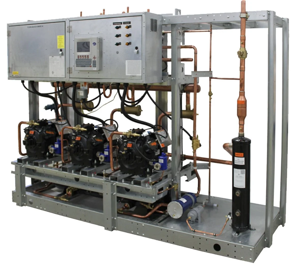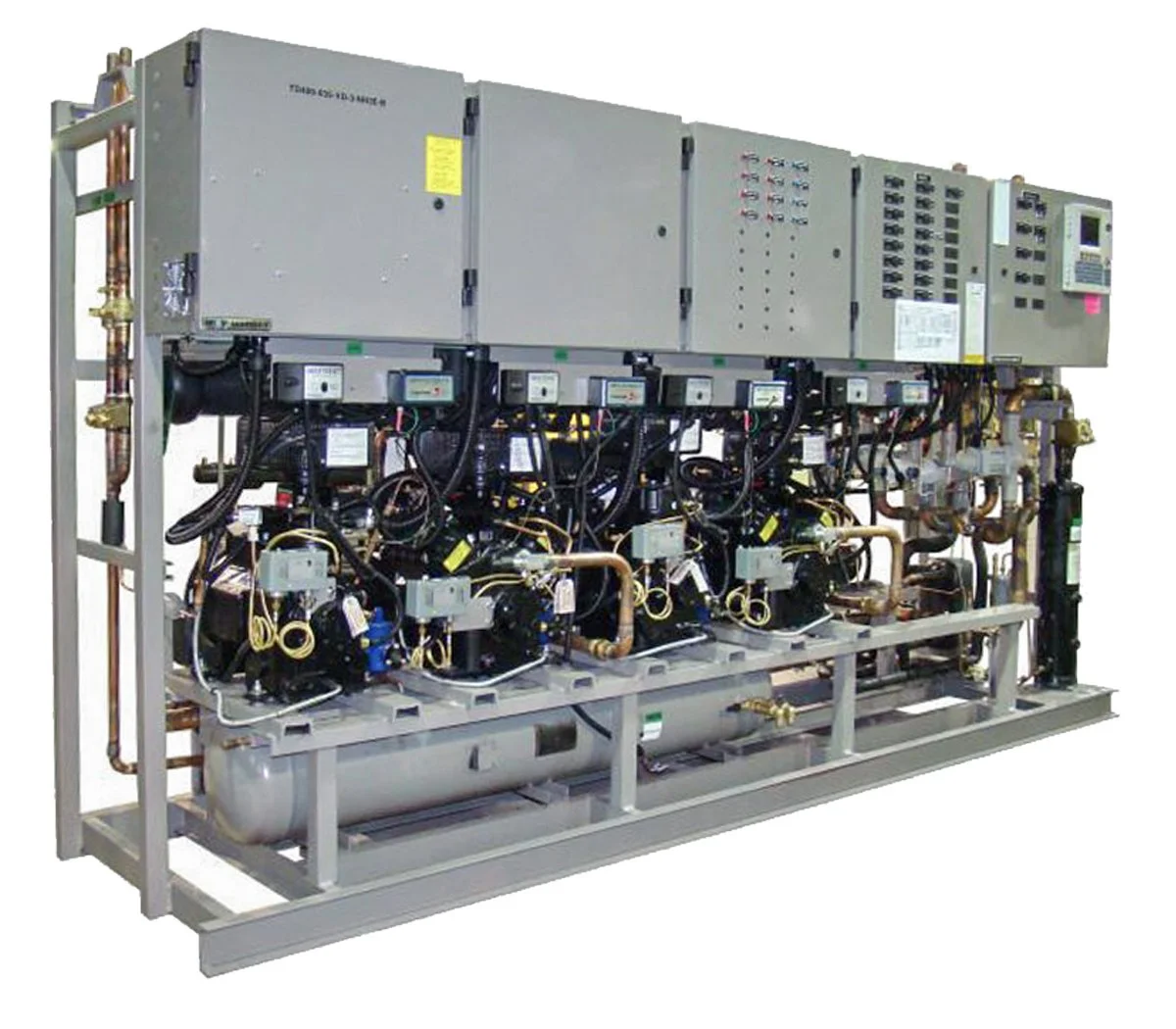 The NH2 and NHS are Kysor Warren's indoor centralized parallel rack systems, and the workhorses of the industry. Both are flexible, proven platforms that can meet the refrigeration needs of a broad range of retailers — from small independents to large-format supermarkets — in both new construction and replacement system applications. The NH2 features a horizontal receiver configuration that keeps overall system height manageable within a standard machine room while supporting up to 12 compressors, giving it a wide capacity range that scales to the size of the store. The NHS Slimline variant delivers the same proven parallel rack architecture in a narrower cabinet profile, purpose-built for retailers where machine room footprint is at a premium. Both systems are compatible with the full range of circuit and loop piping configurations and feature the straightforward, familiar design that makes them easy for refrigeration contractors to install and service. For retailers who need a dependable, high-capacity indoor centralized system with a long track record, the NH2 and NHS are the benchmark choices.