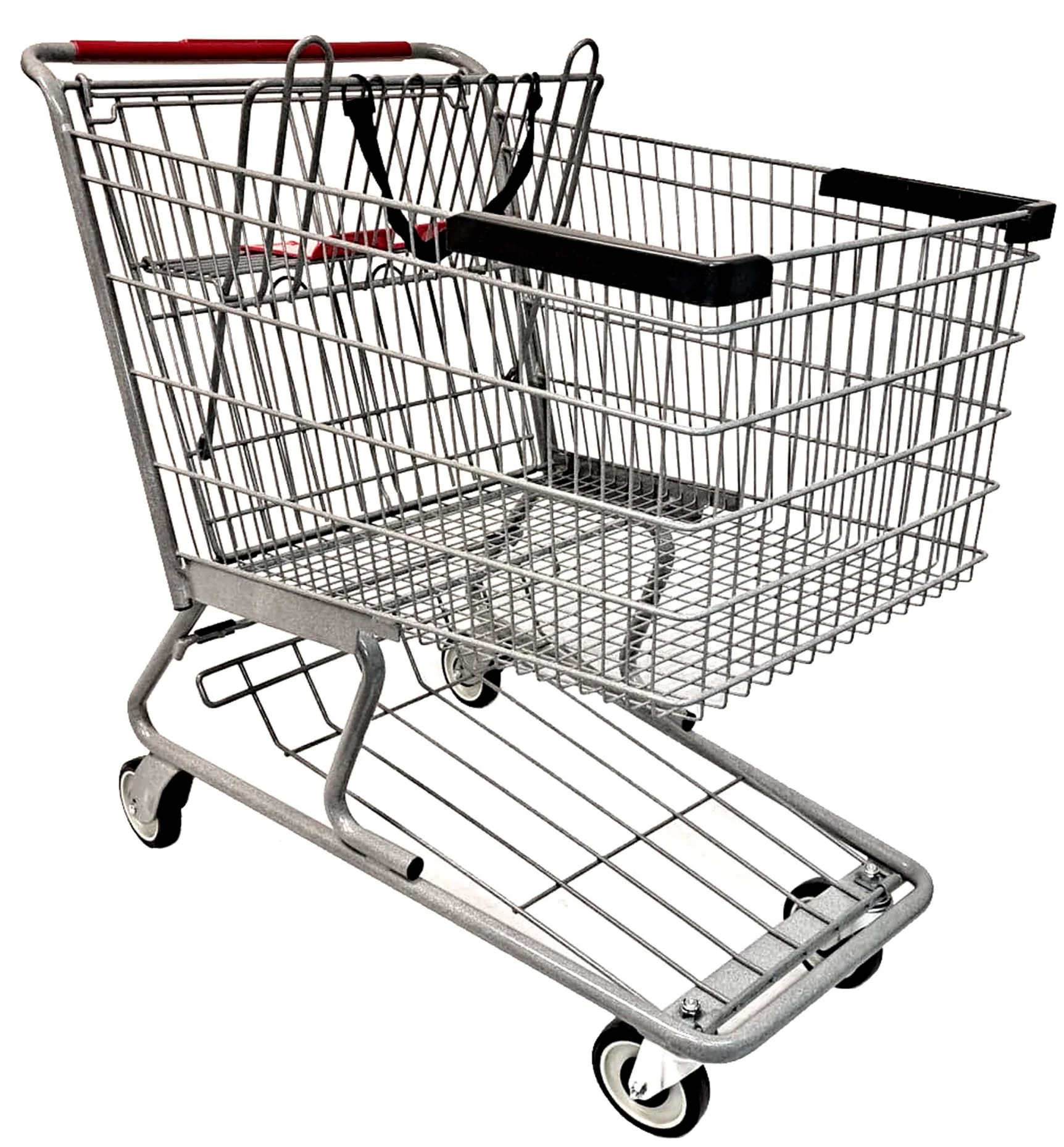 The 6142 is a new compact metal shopping cart purpose-built for the everyday demands of grocery and food retail environments. Sitting between a 2-tier express cart and a large-format model, the 6142 offers a practical, well-balanced footprint — large enough to accommodate a meaningful shopping trip, yet maneuverable enough for standard grocery aisles and tighter store layouts. Its welded steel construction delivers the structural rigidity and durability that high-traffic retail requires, and the durable powder-coat finish holds up against daily wear, scratches, and moisture. A single child seat with a safety belt adds convenience for family shoppers, and the cart's clean, traditional appearance keeps your front end looking sleek.